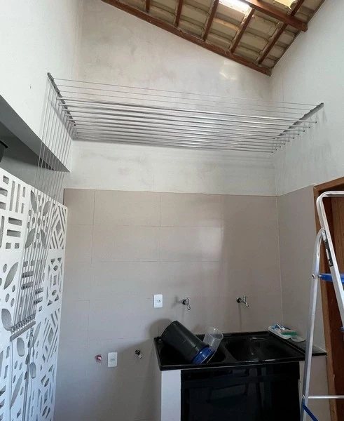 - Otimização de Espaço: é uma excelente opção para otimizar o espaço em ambientes pequenos, já que aproveita a área vertical da casa. Ao elevar as roupas para o teto, libera-se espaço no chão, tornando o ambiente mais organizado e funcional;